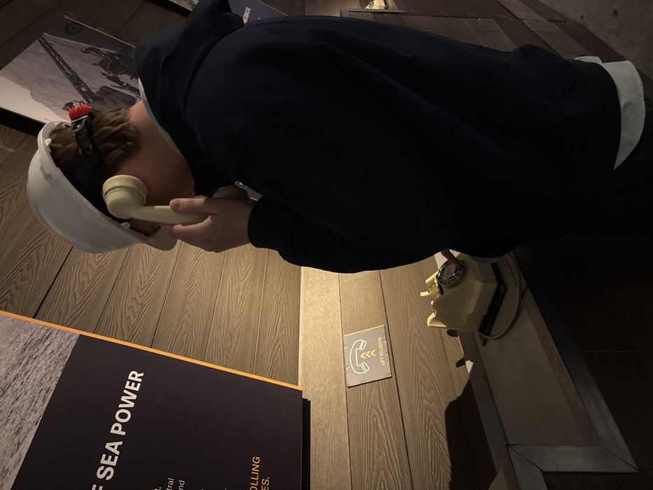 An individual is depicted from the rear-right, wearing a white hard hat with a dark strap and red clip, and a dark blue hooded sweatshirt over a white undershirt. The person is holding a beige vintage telephone handset to their right ear, interacting with an exhibit. The scene is located within an interior exhibit space, likely one of the military heritage tunnels or museums on the Rock of Gibraltar, such as the World War II Tunnels. To the left, a large dark informational panel displays partial white text, prominently featuring "F SEA POWER" near the top. Below this, on a wall with horizontal light brown wooden paneling, a smaller square sign with a white telephone icon and the text "LIFT TO LISTEN" is mounted. A beige rotary telephone base with a coiled cord rests on a gray display shelf beneath this sign. The environment is dimly lit, with additional dark display panels vaguely visible in the background to the right.