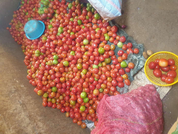 The scene, set in Machakos Central ward, Kenya, depicts a large quantity of produce arranged on a floor, indicative of a market environment