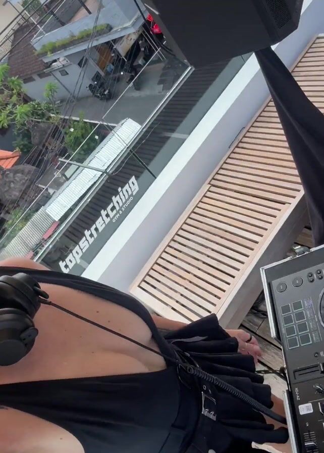 woman standing on a balcony, likely preparing to DJ