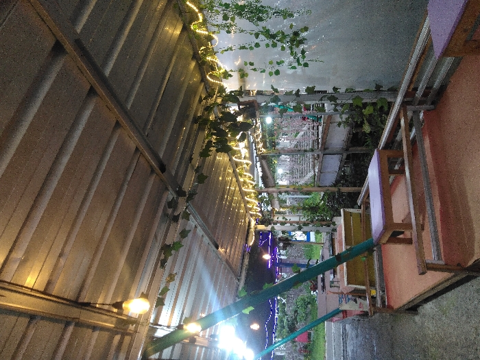 - "An outdoor scene features tables with wooden frames and purple, yellow, and orange surfaces, partially under a metal structure draped with greenery and strings of lights" by FM-lcyaM2, licensed under CC BY 4.0