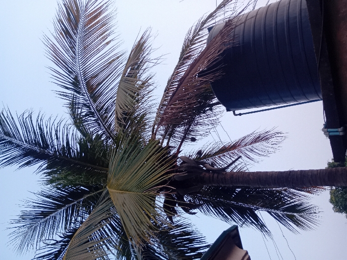 A low-angle shot features a coconut tree with its fronds reaching into a light blue sky. A dark, cylindrical water tank sits atop a pole structure to the right, partially obscured by the tree's leaves. The tree's trunk is visible, extending horizontally across the frame. The scene is mostly outdoors.