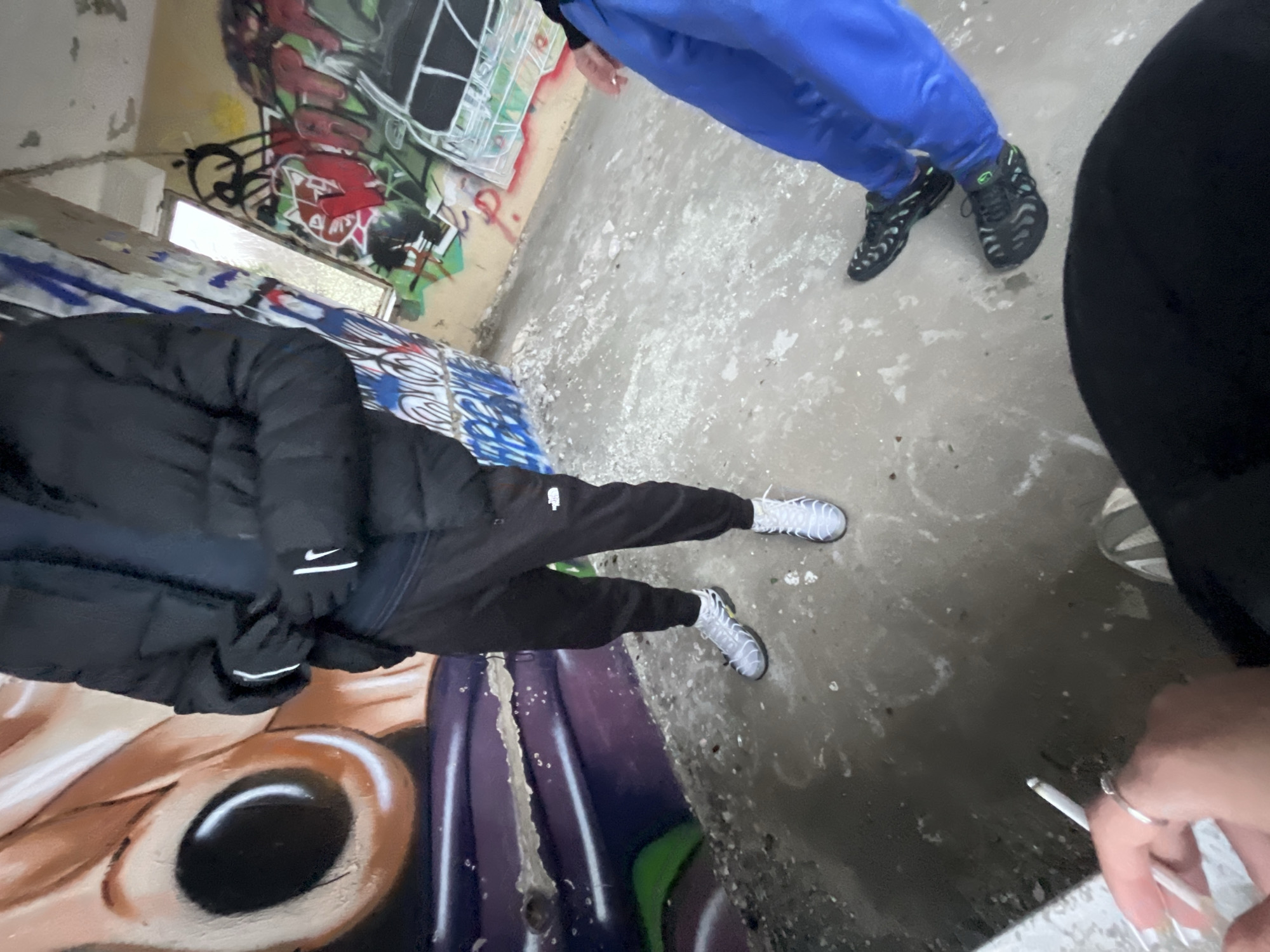 The image appears to be taken indoors, possibly in an abandoned or dilapidated building in Ruse, Bulgaria. The walls are covered in graffiti. There are three or four people present, with only their legs and lower torsos visible in most cases. One person is wearing blue sweatpants and black Nike TN sneakers. Another person is wearing black sweatpants and white shoes with grey accents. A third person is wearing a black puffer jacket with a visible white Nike logo. A fourth person in the foreground appears to be holding a cigarette and a lighter. The floor is concrete and appears dirty. The overall scene suggests an informal gathering, potentially involving smoking, in a neglected urban environment.