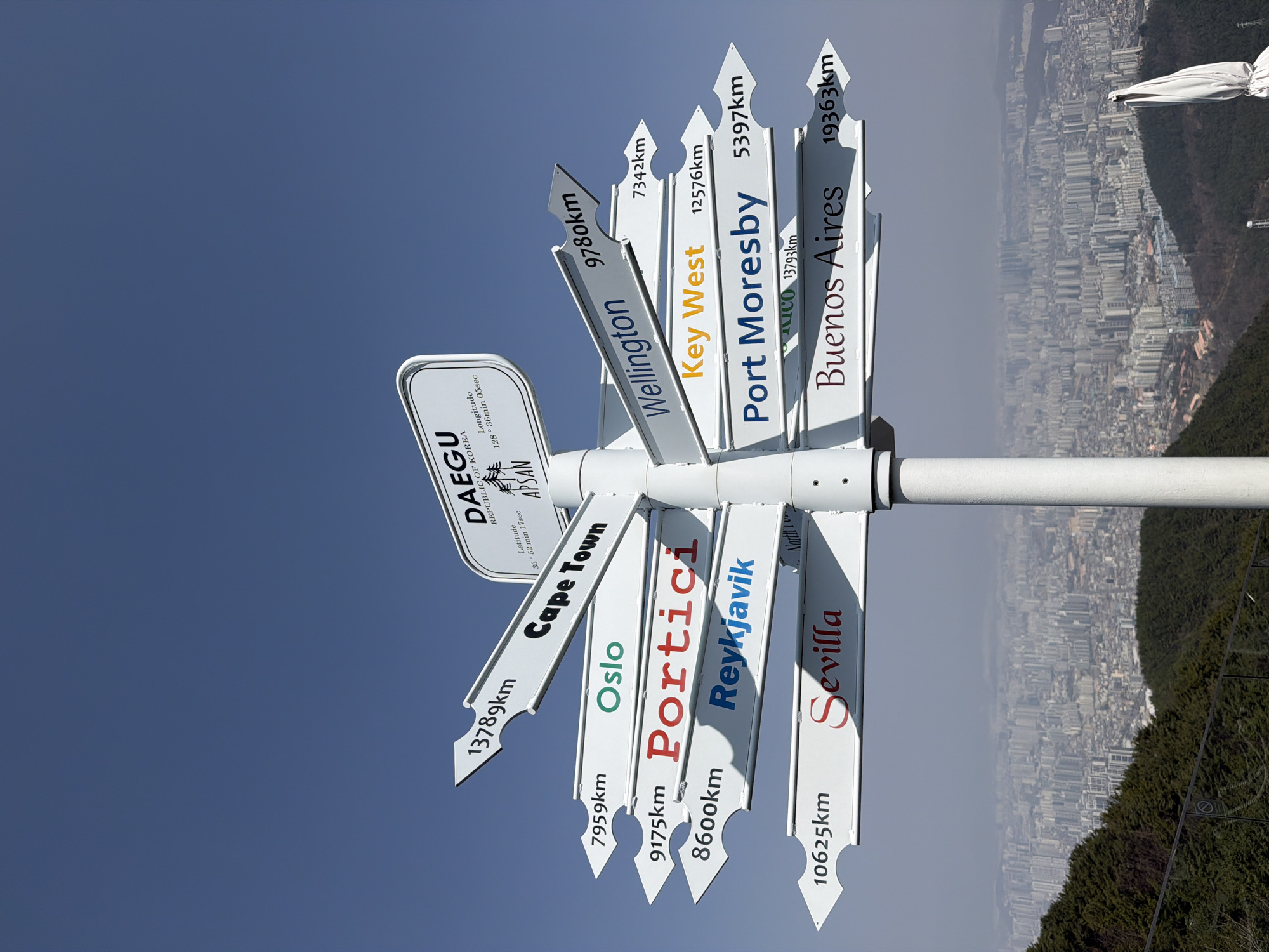 A white, multi-directional signpost stands atop Apsan Mountain in Daegu, Republic of Korea, against a clear blue sky