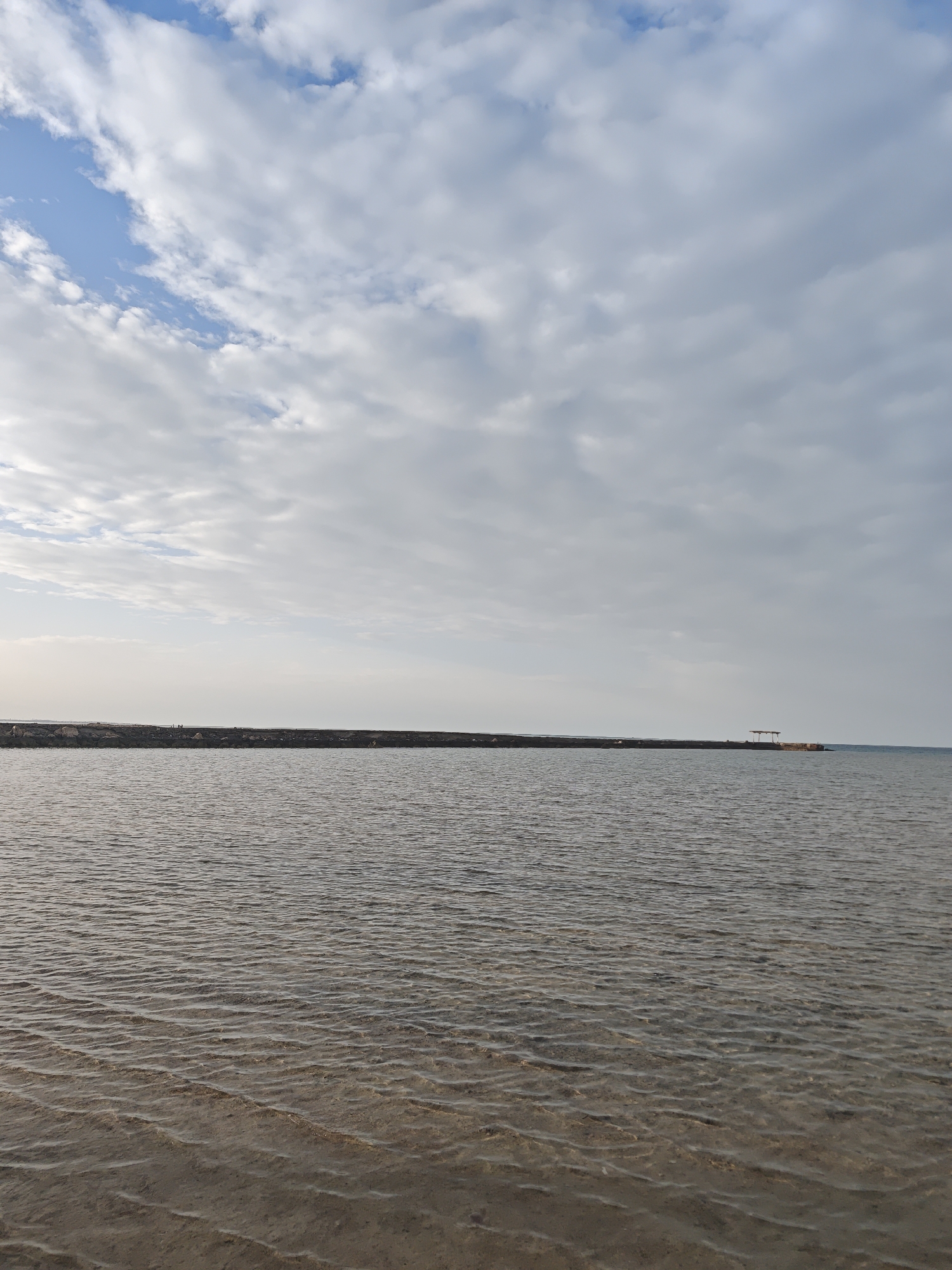 The image displays a coastal scene in Al Ahia', Egypt. The lower half of the frame is occupied by shallow, rippled water, through which a sandy bottom is visible in the immediate foreground. Extending horizontally across the mid-ground is a dark-colored breakwater, constructed from large rocks or concrete, separating the nearshore water from the distant horizon. Two small, indistinct, upright figures are observed on the breakwater, approximately centered within its visible length. At the far right end of the breakwater, a small, open-sided shelter with a reddish-brown roof stands. The upper half of the image shows a sky largely covered by diffuse grey and white clouds, with areas of blue sky visible, primarily in the upper left quadrant. No discernible actions or interactions are observed beyond the static presence of the figures and structures.