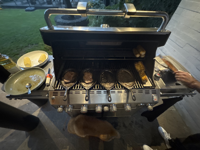 An open stainless-steel grill sits on a patio with meat cooking in four cast iron pans. Corn on the cob is placed on the upper rack and to the side of the grill. A dog sits on the patio between the viewer and the grill. To the left of the grill sits a platter with corn and a bowl with a spoon. A person standing to the right of the grill appears to be holding a spatula.