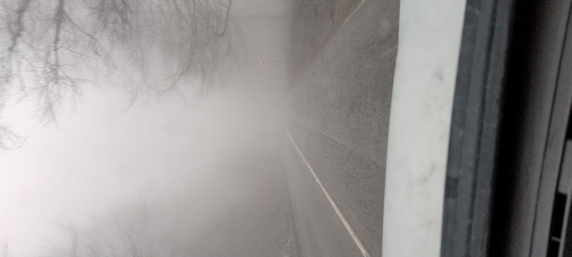 The scene depicts a rural or semi-rural road in Barziya, Bulgaria, enveloped in extremely dense fog. The perspective is from inside a vehicle, with the top edge of a white dashboard or hood visible in the lower foreground. The asphalt road surface appears wet or damp and extends straight into the obscured distance, marked by a continuous white line on the left side of the lane. On the right side of the road, approximately mid-distance from the camera, a red-bordered triangular warning sign with a black winding road symbol is erected. Bare, leafless tree branches are faintly visible on both sides of the road, particularly extending from the right into the thick, greyish-white fog that severely limits visibility. No individuals, other vehicles, or specific interactions are discernible within the frame. The environment is characterized by low light and a uniform, heavy atmospheric obscuration.