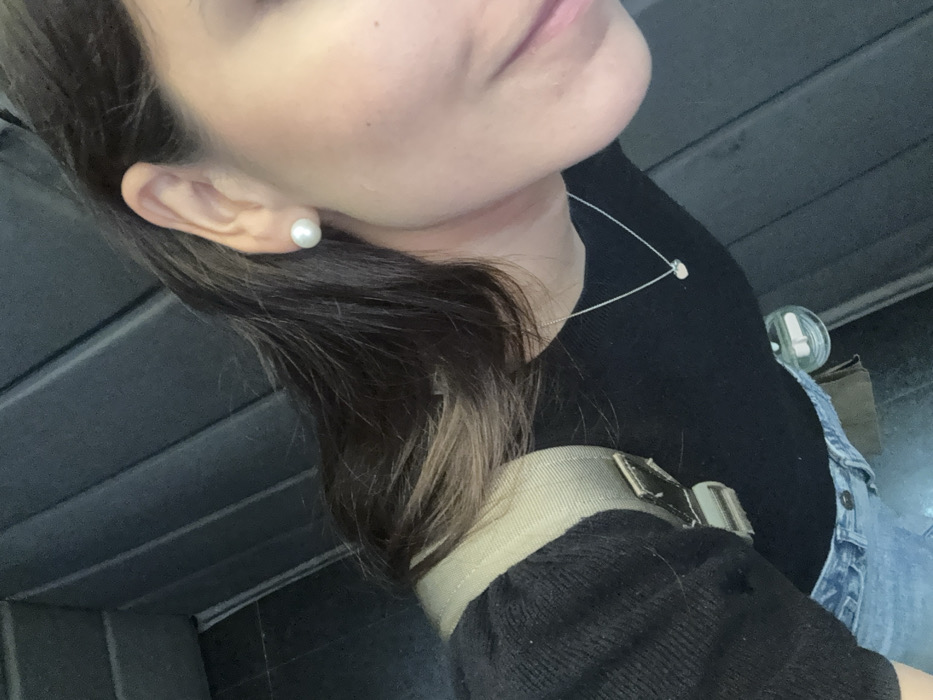The scene depicts a partial view of a female individual within an enclosed, dark interior space. The location within Santa Catarina, Mexico, is not discernible from the image. **Subject:** A female individual, seen from the upper torso upwards, with the right side of her face visible. She has dark, straight hair extending over her shoulders. Her skin tone is light. Her mouth is slightly upturned on the right side, suggesting a subtle smile. **Attire and Accessories:** She is wearing a black, long-sleeved top or sweater. A thin silver chain necklace with a small, light-colored pendant is visible around her neck. A spherical white pearl stud earring is present on her right earlobe. A tan or beige-colored strap, consistent with a backpack or shoulder bag, is visible over her left shoulder, secured by a metallic buckle. Light blue denim material, likely from jeans, is visible below her black top. **Environment:** The background consists of dark, possibly black or dark gray, textured paneling or upholstery, with diagonal or horizontal ridges, suggesting the interior of a vehicle or a confined space. In the lower right quadrant of the image, a partially visible circular object with a clear outer rim and white internal elements rests on a dark surface. No specific actions or interactions with other individuals are evident.