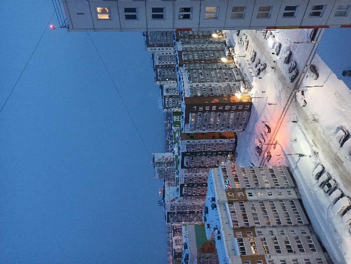 A cityscape at twilight reveals rows of apartment buildings. The sky transitions from light blue to dark blue. Snow covers the ground. Cars are parked in designated spots. Streetlights illuminate the roads and parking areas. The buildings show a mix of beige, white, and orange tones. Some buildings have distinct murals. Power lines stretch across the sky above the buildings.