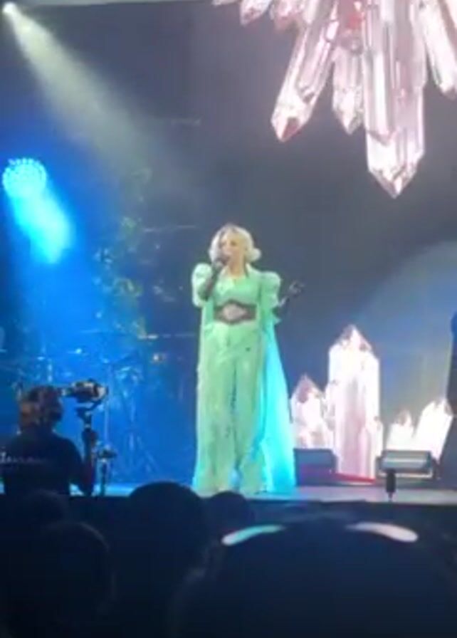 A woman with light blonde hair is singing onstage at a concert. She is wearing a light green costume and black gloves, and holding a microphone. Behind her are stage lights, a band, and large decorative crystals. A crowd is watching her perform, with some people holding up phones to record the event.