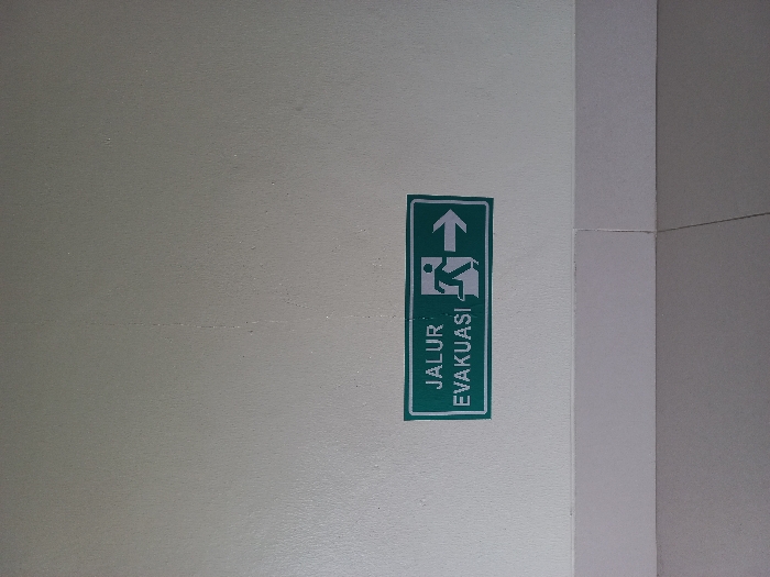 A green rectangular sign displays a stick figure running toward an upward arrow. Below the stick figure, the words "JALUR EVAKUASI" are vertically stacked. The sign is affixed to a smooth, light gray wall. The wall intersects at a corner with a broader, off-white vertical surface. The background consists of two tones of gray.