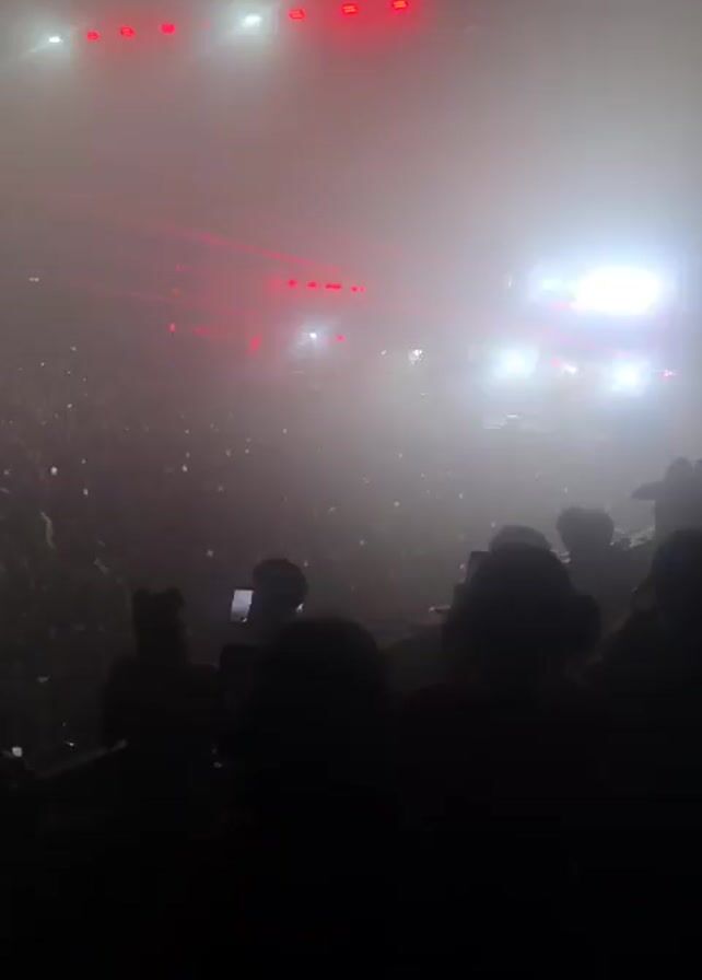 concert or event venue with a large crowd. The video is shot from an elevated perspective, possibly a balcony or platform, behind a group of people. The lighting alternates between bright white and intense red, creating a dramatic effect. The crowd is dense, and many people are holding up phones, seemingly recording the event. The stage, visible in the distance, is lit with several bright lights and appears to have an active performance ongoing. The atmosphere is filled with smoke or fog, enhancing the visual effects.
