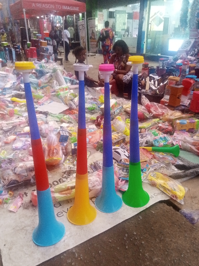 An outdoor market scene is depicted in the city of Unknown, Unknown, primarily focused on merchandise displayed on a street or sidewalk. In the foreground, four multi-colored plastic vuvuzela-style horns stand upright on a light-colored ground covering. From left to right, their color schemes are: a light blue bell, red mid-tube, blue upper tube, and yellow mouthpiece; a yellow bell, red mid-tube, blue upper tube, and white mouthpiece; a light blue bell, blue mid-tube, white upper tube, and pink mouthpiece; and a green bell, blue mid-tube, yellow upper tube, and yellow mouthpiece. The ground covering beneath the horns is densely covered with various individually packaged items, predominantly toys and novelty goods, including cube puzzles, plastic vehicles, and small figurines. In the mid-ground, two individuals are seated on the ground behind the merchandise. One individual on the left has braided hair and wears a dark top. The other, a woman on the right, wears a patterned garment and is looking downwards. The background features a public street or pathway with pedestrians. On the left, a red canopy tent is visible, bearing the text "A REASON TO IMAGINE." To its right, a white sign displays "C75" and "P19." Further back, commercial storefronts with large glass windows are evident, one of which has tinsel-like decorations draped above its entrance, suggestive of seasonal festivity. Other market stalls and containers are present in the deeper background. The scene depicts a retail environment with merchandise openly displayed for sale.