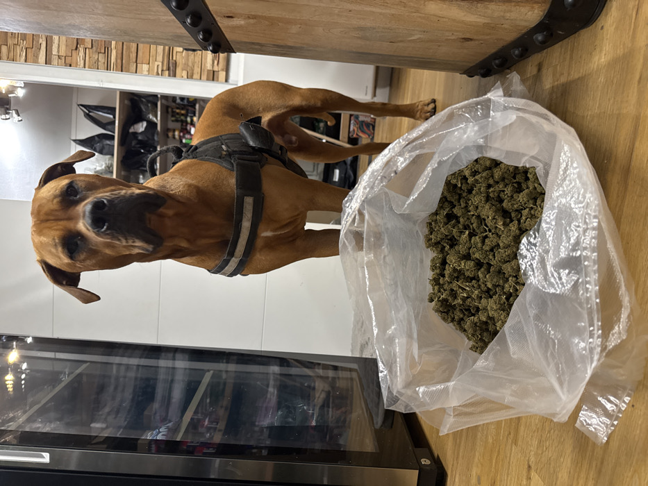 This image, captured indoors in Puteaux, France, presents a large, reddish-brown dog standing behind an open clear plastic bag. The bag, positioned centrally in the foreground on a light-colored wooden floor, is filled with a substantial quantity of green, dried plant material consistent with cannabis buds. The dog, a large breed with short fur and droopy ears, is equipped with a dark harness featuring light-colored reflective strips across its chest and shoulders. Its head is raised, and it looks directly towards the viewer. To the immediate left of the dog and behind the bag, a tall, dark, glass-fronted appliance, possibly a wine cooler or refrigerator, is visible, reflecting ambient light. To the right, a segment of a light-brown wooden structure with dark, rounded metal studs or accents is present. The background features a white wall with a shelving unit on the right, displaying various items, including dark bags and bottles. The overall environment appears to be an interior space, likely residential, illuminated by overhead lighting. There are no other individuals present in the frame, and no discernible interaction other than the dog's direct gaze.