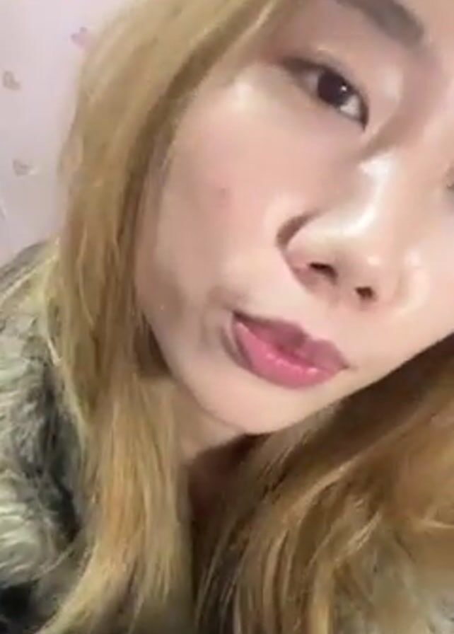 A close-up shot shows a young woman with shoulder-length blonde hair. She is wearing a dark jacket with a furry collar. Her skin appears glossy. She is looking directly at the camera with a slight smile. The background is a light pink wall.