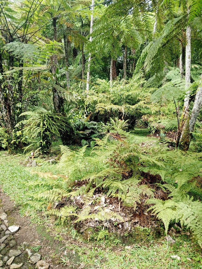 The scene depicts a dense, vibrant green forest, likely situated within the Bà Nà Hills Nature Reserve in Đà Nẵng, Vietnam. The dominant vegetation consists of numerous tree ferns with large fronds extending throughout the midground and background, interspersed with various smaller ferns and ground cover plants. Several slender trees with light-colored, textured bark rise vertically within the dense foliage. The forest floor shows areas of short green grass, patches of exposed dark soil, and a discernible irregular stone border or path in the lower left foreground. Natural daylight illuminates the vegetation. No individuals, animals, or man-made structures are present within the frame.