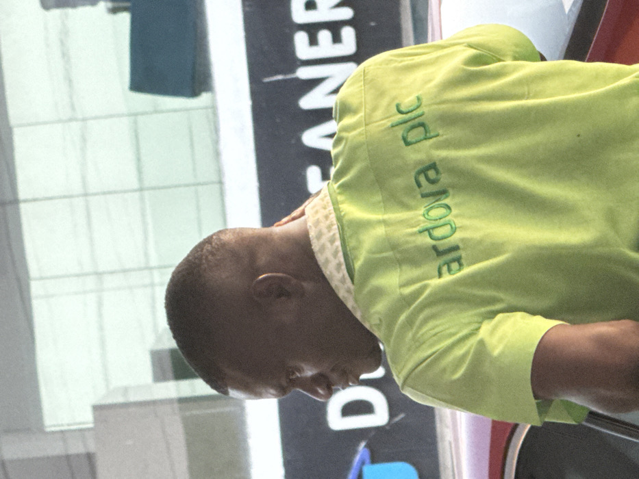 A man in a bright green shirt with the words "ardova plc" embroidered in green thread is seen in profile. The shirt has a patterned collar. The man has short hair. He appears to be looking down. The background includes a partially visible sign that says "ANER" in large letters and parts of what looks like a building with glass windows.