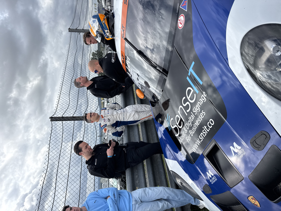 Six adult males are gathered at the Sachsenring motor racing circuit in Hohenstein-Ernstthal, Germany. The foreground features the front portion of a blue, white, and black Porsche race car. The vehicle's hood is adorned with "Sense IT" branding for "Music & Digital Signage for Businesses" and "Melamed Motorsport" logos. An orange and blue racing helmet, bearing a "SIXT" logo, rests on the car's roof near the windshield. Behind a grey metal barrier, the six males stand. From left to right: one male wears a light blue hoodie and jeans, arms crossed; a second male in dark attire is focused on a smartphone; a third male, identified as a driver by his white and blue racing suit featuring "GP" and "Mobilg" logos, looks forward; a fourth male in dark clothing looks to the right; a fifth male, bald and wearing dark sunglasses with a "GP elite" logo on his dark top, faces left; and a sixth male in dark attire looks to the right. A tall chain-link fence is visible behind the group. The background shows distant structures and natural terrain under a heavily overcast sky. The ground appears dark, consistent with an overcast day at a race track.