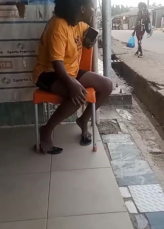 A woman sits on a plastic chair outside a building, looking at her phone. She is wearing an orange t-shirt, black shorts, and flip-flops. A street runs alongside the building with a person walking in the distance. The side of the building is tiled and there are posters on the wall. Music plays in the background.