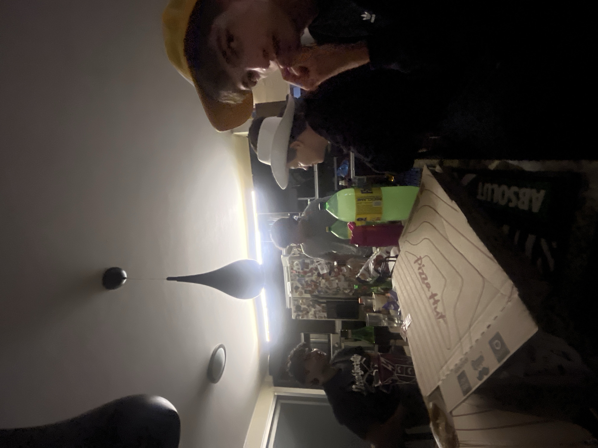 This image depicts an indoor social gathering within a residential space in the city of Cholula, Mexico. The scene is dimly lit, illuminated by ceiling fixtures and a horizontal strip light. Four individuals are present. On the far right, a young male wearing a yellow brimmed hat and a dark shirt with an Adidas logo is visible, looking towards the camera with his right hand near his mouth. To his left, another person wears a white cowboy-style hat and a dark jacket, seen in profile facing left. Further left, a male in a grey t-shirt stands partially obscured behind a table. On the far left, a fourth male wearing a dark t-shirt with a graphic design is partially visible, facing towards the center. In the foreground, a partially open "Pizza Hut" cardboard pizza box, featuring a topographical map-like design, rests on a table. Below it, a dark object with "ABSOLUT" branding is visible. The table also holds several bottles, including green glass bottles, a large green plastic bottle, a red plastic bottle, and clear drinking glasses. The background reveals a kitchen area with a refrigerator covered in numerous magnets and papers, positioned beneath a horizontal fluorescent strip light. To the left of the refrigerator, a dark counter and what appears to be an appliance are visible. The ceiling features three light fixtures: two dark, teardrop-shaped pendant lights and one smaller, circular recessed light.