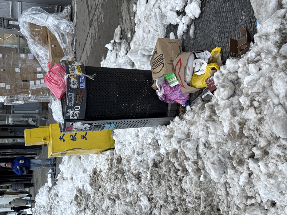 The image depicts an urban street scene in New York City, United States of America, during winter conditions. The foreground is dominated by a significant accumulation of dirty, melting snow and slush covering the sidewalk. A black, perforated metal public trash can stands centrally, its upper rim adorned with various stickers including "MAMBO," "Kallejeras," and biohazard symbols. A pink plastic bag, presumably filled with trash, rests precariously on the top of the bin. At the base of the trash can, refuse overflows onto the snow-covered sidewalk, comprising several paper bags (one visibly from "Shake Shack"), a purple plastic bag, a yellow plastic bag, cardboard pieces, and other discarded items. To the left of the trash can, a tall, yellow newspaper vending box is partially obscured by snow. The Chinese characters "大紀元" (Dàjìyuán - The Epoch Times) are visible on its side. Further left, a male individual in a blue jacket and jeans stands on the sidewalk, holding a white cup. Several other pedestrians, bundled in winter attire, walk along the sidewalk in the background. To the right and behind the trash can, large stacks of goods in cardboard boxes, wrapped in clear plastic sheeting, are visible against building storefronts, indicating a commercial area. The overall scene suggests an overcast day with diffused lighting.