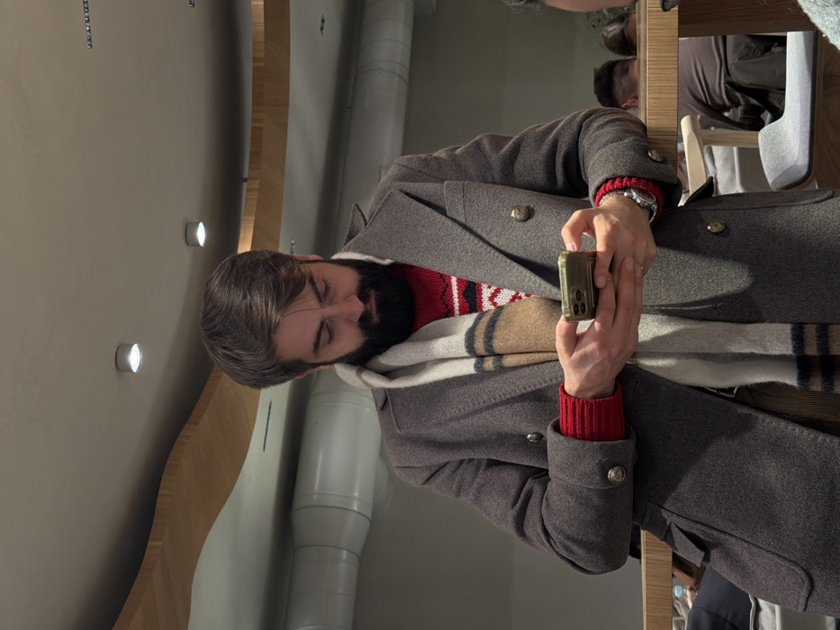 A man with a beard, wearing a red patterned sweater and a striped scarf under a gray coat, is holding a smartphone. He's indoors with other people in the background. A wooden beam and cylindrical white structures are visible along the ceiling. He seems to be focused on the device.