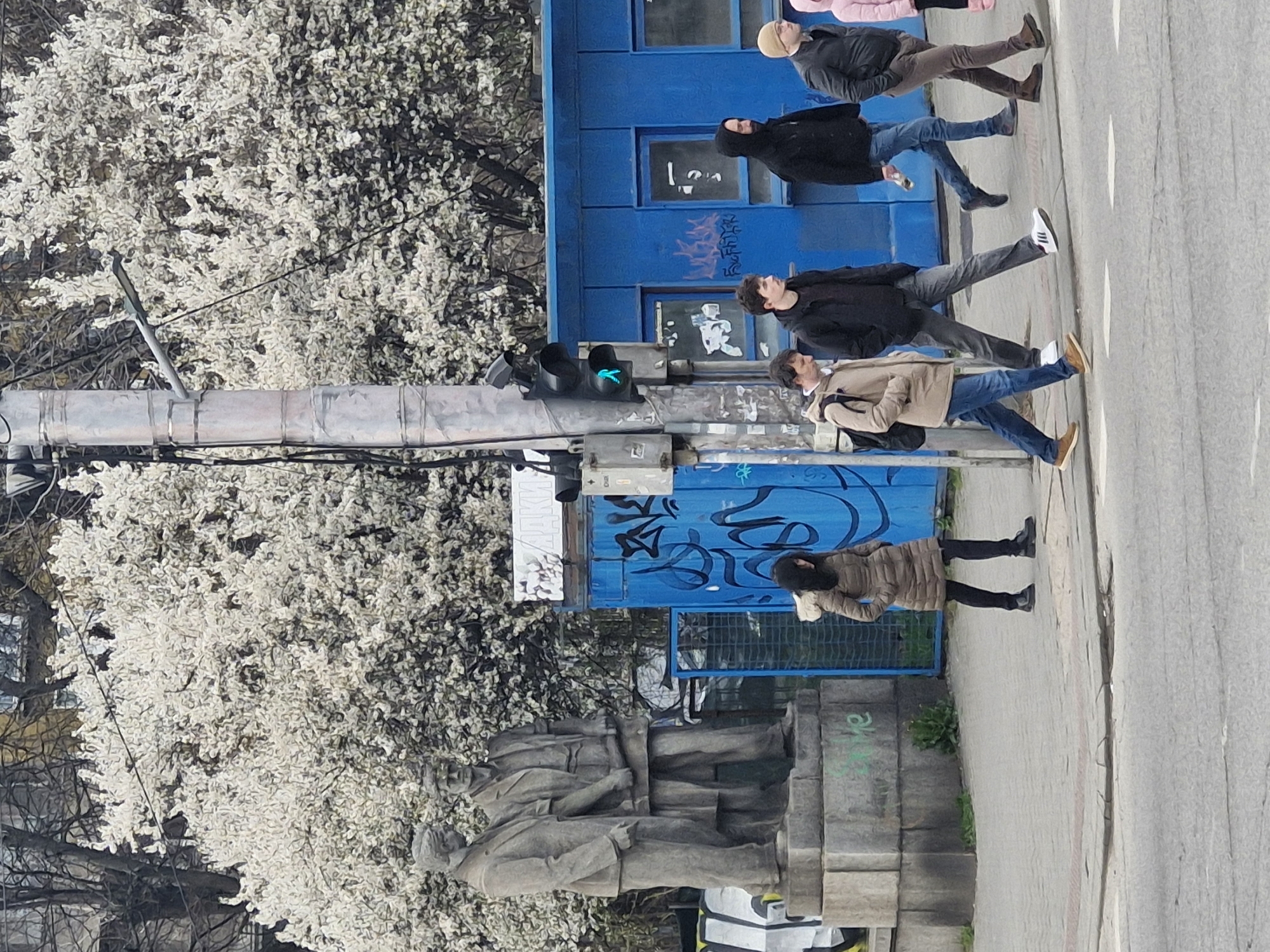 street scene in Sofia, Bulgaria. A statue of Pencho Slaveykov and Petko Slaveykov stands next to a pedestrian crossing. Five people are crossing the street in a line, heading to the right side of the frame. The first person wears a brown coat. The second wears a tan jacket. The third wears a black jacket with white soled shoes. The fourth wears a black hooded jacket. The fifth wears a tan jacket with a tan hat. Behind the crosswalk is a blue painted building with graffiti. A street light with a green light is next to the building. A blooming tree is on the left. A concrete walkway is on the right. The road is gray.