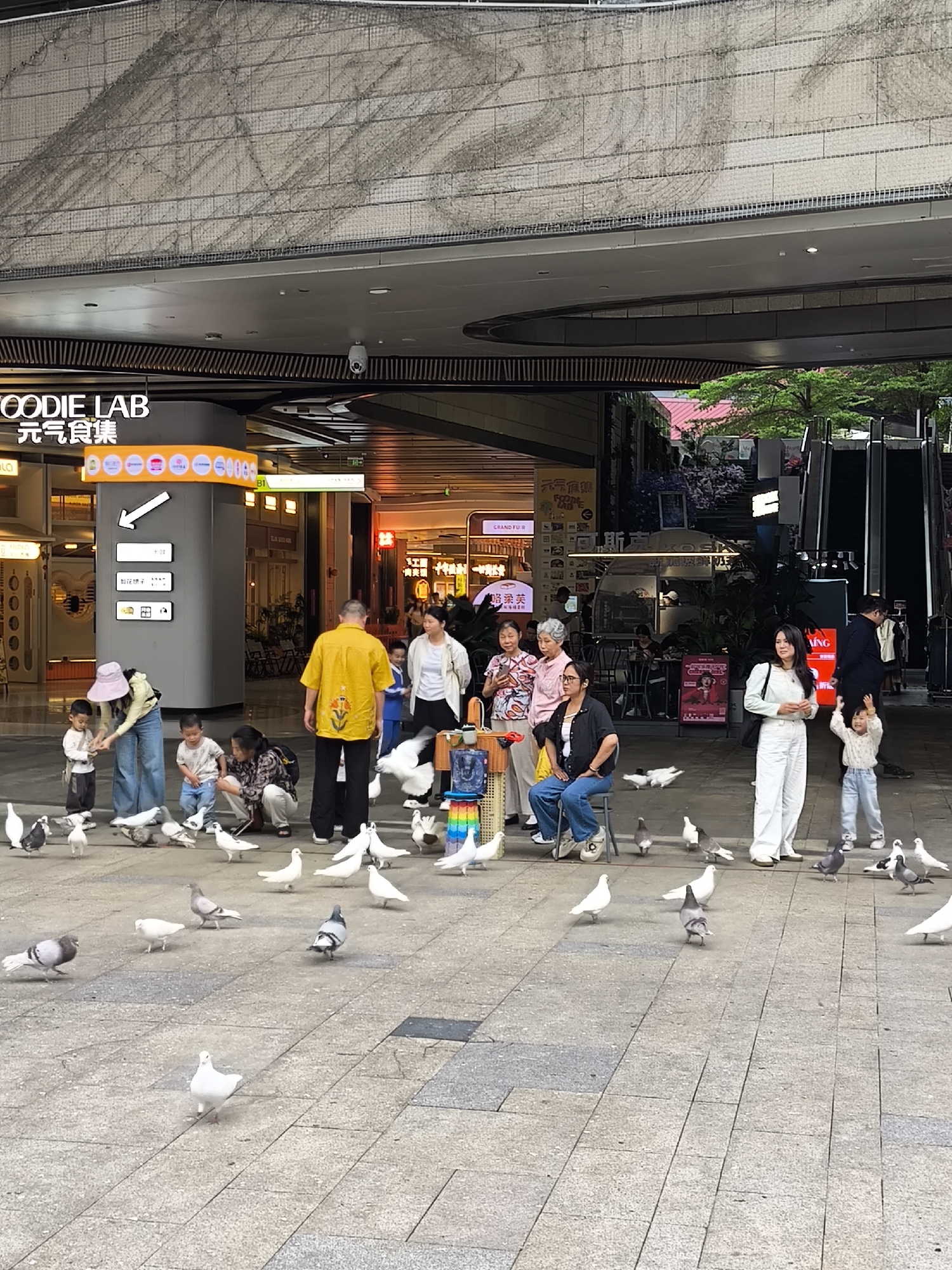 Here's a detailed description of the scene: **Location and Environment:** The photo appears to be taken on a paved, open public plaza, likely within the Longgang District of China. This is suggested by the presence of Chinese signage and architectural style. The area is partially covered by an overhanging structure, possibly part of a commercial building or shopping mall. **Subjects and Actions:** A diverse group of people are present, mainly adults and some young children. Many of them are interacting with pigeons, which are scattered across the plaza. Several people are feeding the birds, while others seem to be simply observing or enjoying the scene. **Objects:** A sign for "FOODIE LAB" (written in both English and Chinese) is visible. There's a small, colorful cart or stand in the center of the group, presumably used for selling bird feed or related items. There are also escalators visible in the background. **People:** * Several elderly women are seen, some sitting on stools. * A man in a bright yellow shirt is standing near the group. * Women in casual attire stand and interact with the pigeons with children. **Interactions:** The main interaction is the feeding and observation of pigeons. People are actively throwing feed to the birds, and the pigeons are congregating around them. There's a sense of community and leisure activity taking place.