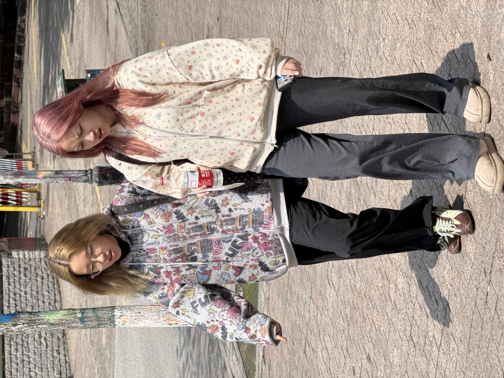 Two young East Asian females walk side-by-side on a light grey paved surface under direct sunlight in Jiulongpo District, China. The woman on the left has shoulder-length light-brown hair and wears clear-framed glasses. She is dressed in a grey zip-up hooded jacket with multicolored cartoon graphics, a black undershirt, black loose-fitting pants, and brown and light-green sneakers. A black backpack is visible on her right shoulder. She looks slightly downwards and to her right. The woman on the right has long, reddish-pink hair and a slightly strained expression. She wears a cream-colored zip-up hooded jacket patterned with small, colorful cartoon figures, dark grey loose-fitting pants, and light beige slip-on shoes. She holds a plastic water bottle with a red label (Nongfu Spring) in her left hand and a smartphone with a colorful case in her right hand. A black shoulder bag is visible on her left shoulder. She also looks downwards. In the background, a low stone wall, a utility pole partially painted blue and green, and red-and-white striped barriers are visible. Shadows of the individuals are cast on the paving to their left.