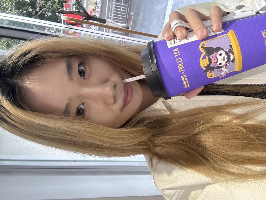 An East Asian female subject is depicted in a close-up, waist-up portrait taken indoors in Longta, China. Her long, straight hair, light brown with visible darker roots, extends over her shoulders. She is wearing a cream-colored collared jacket. Her eyes are directed towards the camera, and a white drinking straw is positioned between her lips, indicating consumption. In her right hand, she holds a tall, purple beverage cup with a black lid and a white straw. The cup features "KUROMI x MOLLY TEA" branding and an illustration of the character Kuromi dressed as a maid. A white paper label, partially visible, shows the text "T102" and Chinese characters. A white, ring-like object is present around her right thumb. The background reveals an urban outdoor environment through a large window, including green trees, a street or sidewalk, and a distant building with a visible "HUAWEI" sign. The scene is illuminated by natural daylight.