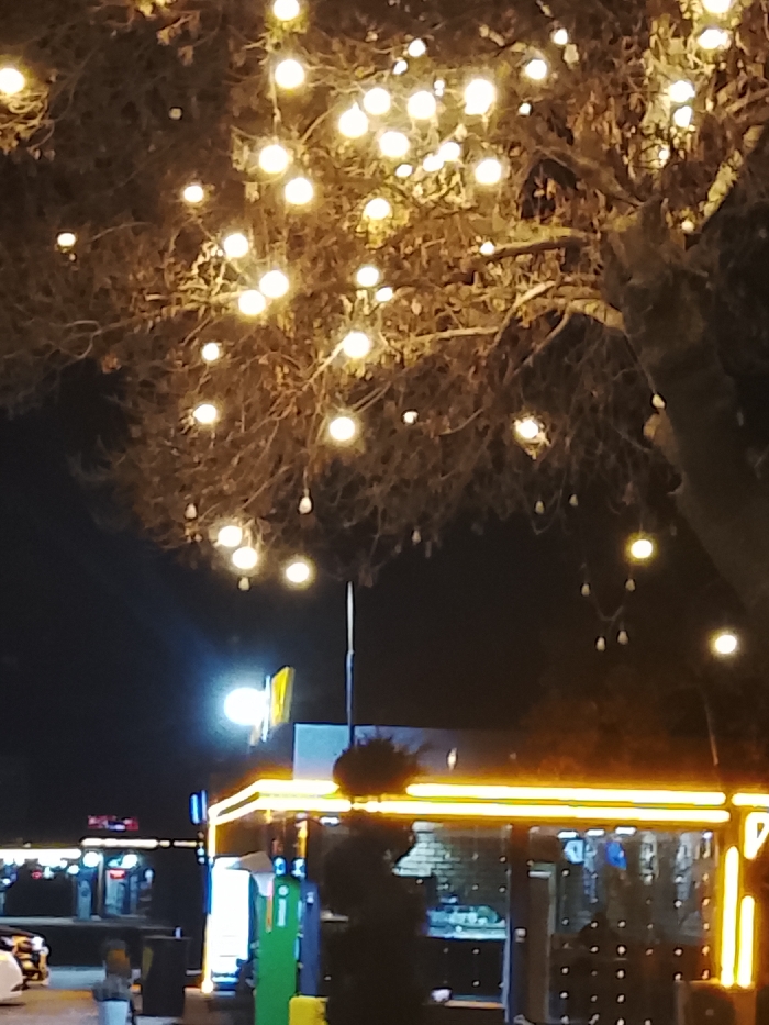 The image displays an outdoor night scene in the city of Sabir Rakhimov, Uzbekistan. The upper two-thirds of the frame are occupied by a large tree, primarily composed of bare branches, which are extensively decorated with numerous spherical, warm-toned string lights. Additionally, several smaller, teardrop-shaped lights hang from the tree branches. Below the tree, an urban or commercial area is visible, illuminated by artificial light sources. A prominent structure with horizontal and vertical yellow strip lighting is present in the mid-ground, featuring large glass panels. To the left of this structure, a bright, circular white light on a pole is visible, alongside a tall, narrow green vertical object. Further to the left, additional indistinct artificial lights from other establishments are observed. The ground level exhibits dark, undefined shapes consistent with street furniture or utility installations. No discernible individuals or active interactions are visible within the depicted scene.