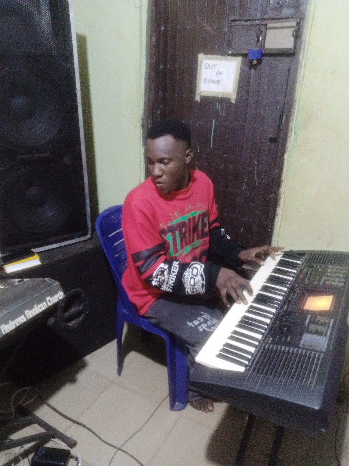 A young man in a red sweatshirt with "STRIKER" on the sleeves and chest sits playing a black electronic keyboard. Behind him stands a large black speaker. To the right is a closed brown door with a sign that says "OUT OF BOUND" attached to it. The man is seated in a blue plastic chair and faces the keyboard directly, his hands positioned to play. Cords and other equipment are visible on the floor near the speaker.