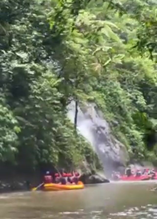 The video depicts a group of people rafting down a river in a lush, green environment. The river is surrounded by dense vegetation. A small waterfall is visible, cascading down a rocky cliff face covered in greenery. The rafters are in multiple inflatable rafts, with each raft carrying several people wearing helmets. The rafts are moving along the river, with the people paddling.