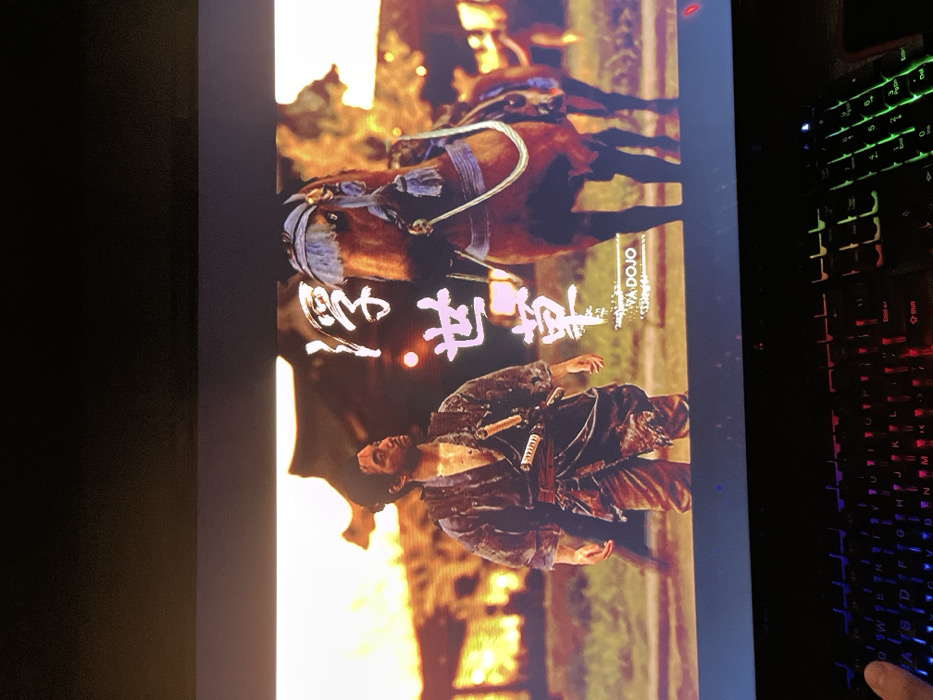The image displays a computer monitor showing a video game scene, viewed from an elevated perspective above a desk with a keyboard. On the screen, a male character in traditional Japanese attire, featuring a dark kimono-style garment and two visible swords tucked into his sash, stands on the left, looking right. A brown horse, adorned with an ornate bridle, headpiece, and white and blue tassels, stands on the right, facing left. Large white Japanese characters "浮世草" are prominently displayed in the upper right quadrant of the screen, with smaller English text "YA DOJO" and "DREAM" below. The background is an out-of-focus, warm-toned landscape depicting Japanese-style architecture and foliage, suggesting an outdoor setting during sunset or golden hour. The lower portion of the photograph reveals a desk and a backlit RGB mechanical keyboard, showing a color gradient from blue/purple on the left to red, orange, and green on the right. A human thumb is visible in the bottom-left corner, resting on the keyboard. This scene was captured in the city of Tbilisi, Georgia.