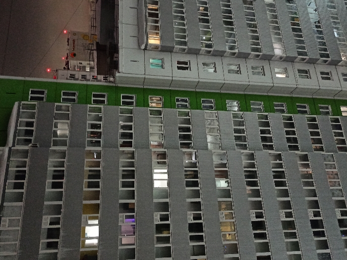 The image depicts a nighttime or low-light exterior view of residential apartment buildings in Кондратово, Russia. In the foreground, a tall, multi-story grey building with numerous windows occupies the left and central frame. Many windows are illuminated, displaying varied interior lighting, including white, yellow, and a distinct purple light on the sixth floor from the bottom. A prominent vertical strip of bright green paneling runs along the right side of this building. To the right, a second, lighter grey residential building is partially visible, featuring balconies and illuminated windows, one with a blue-green tint. In the distant background, atop another building, several red flashing lights are visible, indicative of communication towers or warning lights on a tall structure. A faded sign with Cyrillic text and a yellow circular emblem is faintly discernible on this background building. Snow or frost covers some horizontal surfaces of the buildings. No individuals, specific actions, or interactions are visible. The environment suggests cold weather and a late hour.