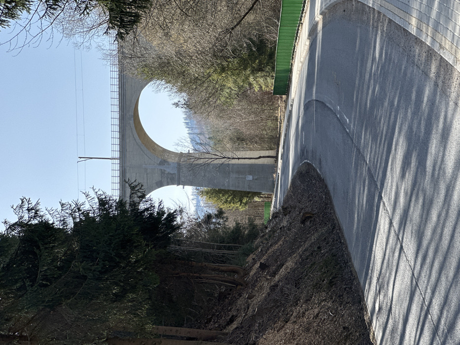 The image displays a scene featuring the historic Wisła Głębce railway viaduct in Wisła, Poland. **Scene Overview:** A large concrete arch viaduct dominates the upper-middle ground, supporting a railway line. In the foreground, an asphalt road curves to the right, bordered by a paved sidewalk and a bright green metal fence. A steep, forested hillside occupies the left side of the frame. **Specific Details:** * **Viaduct:** The central subject is a multi-arch concrete railway viaduct, characterized by its prominent central arch and a sturdy supporting pier. The viaduct's top deck, approximately 20-30 meters above the ground level, is equipped with visible train tracks and overhead electrical lines supported by a single mast. A metal balustrade or railing lines the edges of the deck. Architectural detailing, possibly corbels or decorative elements, are present on the central pier. * **Road:** An asphalt road, approximately 5-6 meters wide, occupies the foreground, curving gently to the right. Faint, worn white lines are visible on its surface. Dark, elongated shadows from unseen trees are cast across the road. * **Sidewalk/Barrier:** To the right of the road, a light-colored, possibly paver-block, sidewalk or shoulder is present. It is bordered by a distinct bright green painted metal fence or barrier, approximately 1.5 meters high, which extends towards the base of the viaduct. * **Left Hillside:** A steep, dark brown earthen slope rises on the left, covered with dry leaves, small branches, and visible tree stumps, indicating recent clearing or natural defoliation. This slope is densely forested with numerous tall, dark green coniferous trees, primarily spruces or pines. * **Background Environment:** Beyond the immediate foreground and under the viaduct, a mix of deciduous trees with bare branches and evergreen trees covers rolling hills, suggesting a mountainous or hilly terrain. Patches of lighter vegetation or possibly remnant snow are visible on distant hillsides. The sky above is clear and bright blue. * **People/Objects:** No people, vehicles, or animals are visible within the frame. * **Lighting/Season:** The scene is brightly lit by natural sunlight, casting distinct shadows. The presence of bare deciduous trees and dry ground cover suggests an early spring or late autumn season.