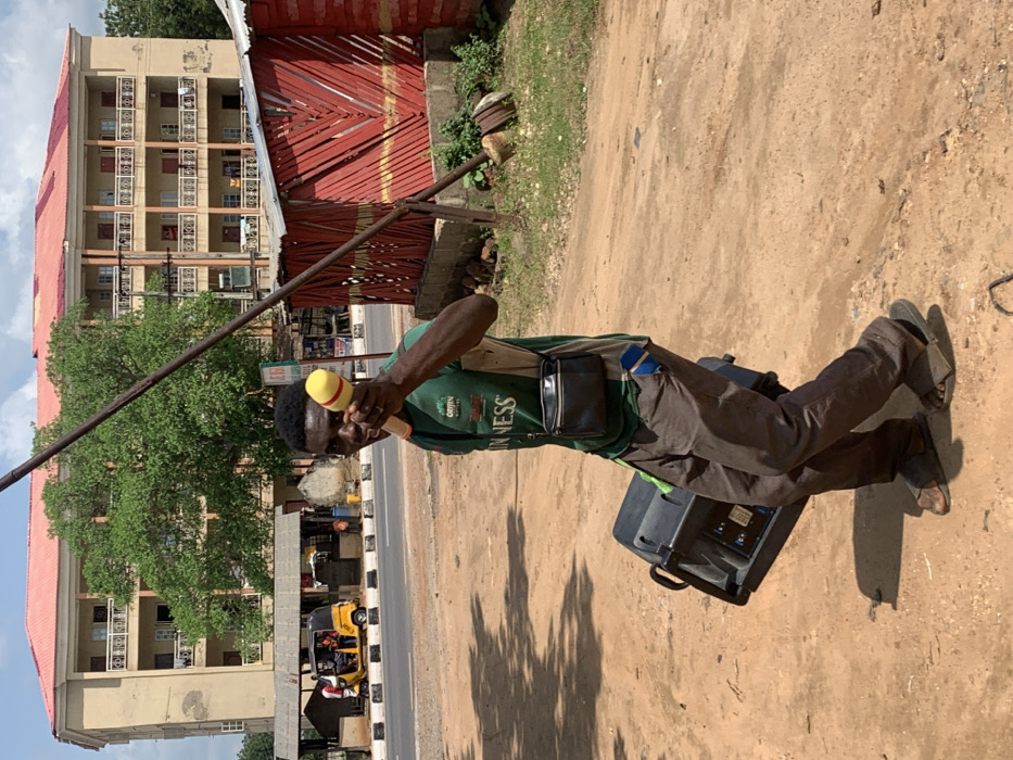 An outdoor scene in the city of Unknown, Unknown, captured under bright daylight. The primary subject is an adult Black male, standing in the foreground on reddish-brown dirt ground, facing the camera with a smile. He wears a green t-shirt with "GUINNESS" visible, brown trousers, and dark flip-flops. A black shoulder bag is slung across his chest, and a blue/white object is tucked into his right rear pocket. He holds a yellow and red maraca-like instrument in his raised right hand and a black, wheeled portable speaker or case in his left hand, which rests on the ground. A dark, possibly rusted, metal pole diagonally spans from the lower-left to the upper-center of the frame. In the middle ground, a paved asphalt road features a yellow three-wheeled auto-rickshaw (Tuk-tuk) containing indistinct individuals, positioned near rudimentary market stalls with corrugated tin roofs. To the right, a red-painted wooden structure with diagonal slats is visible. The background features a large, multi-story beige building with numerous windows, balconies (some with hanging laundry), and a reddish-orange sloped roof. A dense, green-leafed tree partially obscures the building's central section. The sky is partially cloudy.