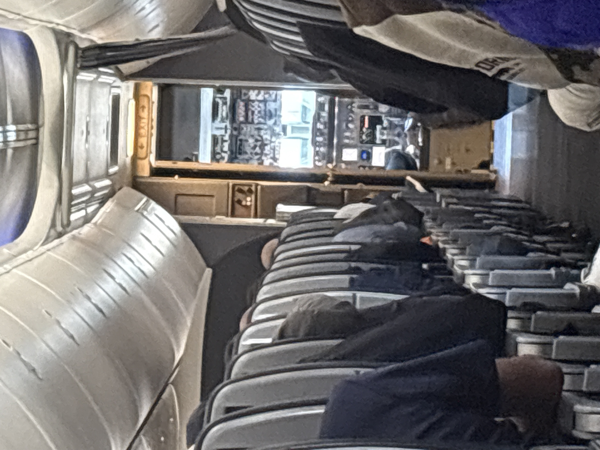The image depicts the interior of a passenger train, likely the Las Vegas Monorail, based on the appearance of the seating and interior design. Passengers are seated in rows, some with their heads resting on the headrests. The driver's cabin is visible at the front of the train, through an opening. The train's interior is illuminated by both natural light entering from the front and overhead lighting. The location is the city of Las Vegas, United States of America.