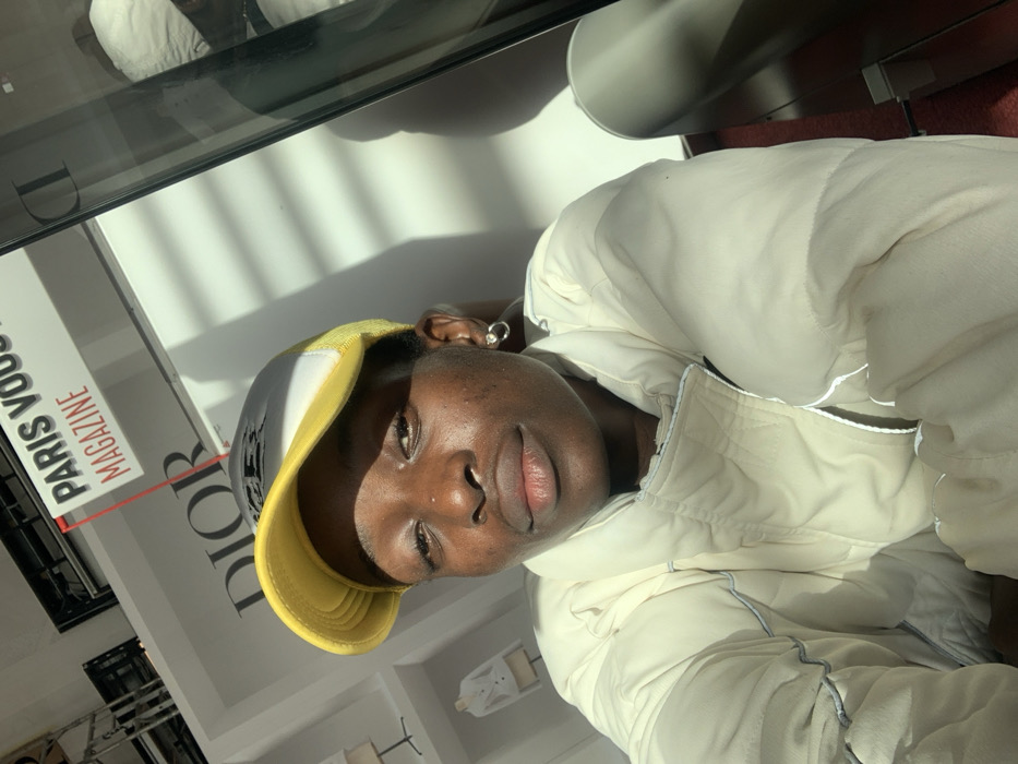 An individual with dark skin, wearing a yellow and grey trucker cap and an off-white puffer jacket with reflective piping, is depicted from the upper chest upwards, directly facing the viewer. A small silver hoop earring is visible in the left ear and a nose piercing on the left nostril. The subject's face and jacket are illuminated by strong, directional sunlight, casting horizontal shadows across the background. The background features a white wall with the large black text "DIOR" prominently displayed. Above and to the right of the "DIOR" logo, a sign reads "PARIS VOGUE" in black and "MAGAZINE" in red. To the far left, indistinct white clothing items are visible on mannequins or displays. A vertical reflective surface, likely a mirror or glass panel, occupies the right side of the frame, showing a partial reflection of the scene. The scene is located inside a commercial or retail space, likely within Paris-Charles de Gaulle Airport, situated in or adjacent to the city of Le Mesnil-Amelot, France.