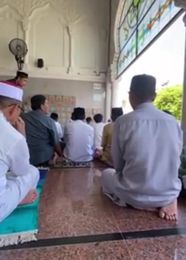group of Muslim men sitting on the floor, possibly in a mosque, preparing for prayer. They are sitting on prayer rugs. A man wearing black clothes and a black peci (cap) distributes something to the men on the side. The men appear to be waiting for a religious event to begin. The interior of the building is tiled and has large arched windows with stained glass. There is a fan on the wall.