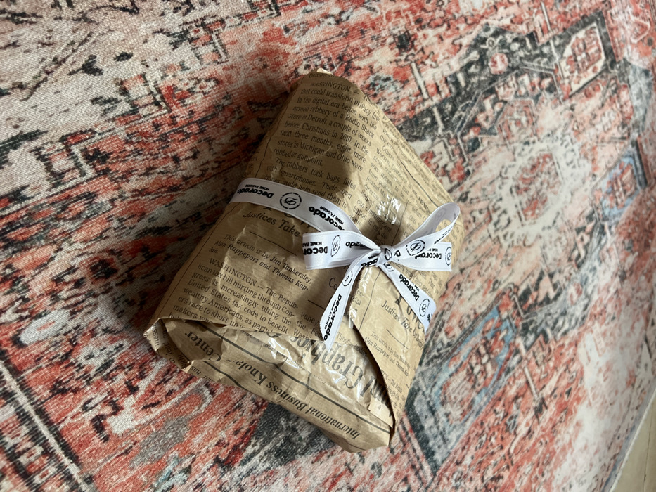 A rectangular package rests on a patterned rug indoors in Givatayim, Israel. The package is wrapped in light brown paper, visibly printed with English newspaper text fragments. A white fabric ribbon, bearing the repeated black text "Decorado HOME FASHION" and a circular logo, is tied around the package, forming a bow centered on its top surface. The rug displays an intricate, faded design predominantly in shades of red, black, and off-white, with subtle blue accents. No people or discernible actions are present.