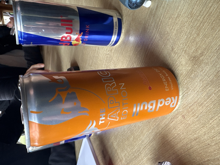 Two Red Bull energy drink cans are positioned on a light-colored wooden surface, likely a table or floor, displaying distinct wood grain patterns. In the foreground, an upright orange and silver "The Apricot Edition" Red Bull can is visible, featuring silver lettering and a depiction of a bull. Text on this can includes "THE APRICOT EDITION" and "ENERGY DRINK Vitalizes body and mind." To the right and slightly behind, a standard blue and silver Red Bull can stands, bearing the Red Bull logo and the phrase "ENERGY DRINK" in English, along with Bulgarian text at the base which reads "Дава ти крила" (Gives you wings) and "Vitalizes body and mind." In the blurred background, several individuals are partially visible, seated or lounging. One person wears dark clothing, with an arm and torso discernible. Another figure's leg or lower body is partially visible further back. A white sheet of paper or notebook is partially visible to the left of the orange can. A small, dark, cylindrical object and a small, irregular white object are also present on the wooden surface in the mid-background. The scene depicts an indoor setting within Sofia, Bulgaria, as evidenced by the Bulgarian text on the blue Red Bull can. No specific actions or direct interactions are occurring with the cans themselves.