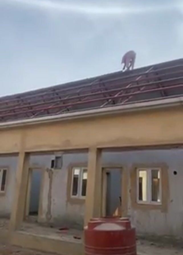 A person is working on the roof of a building. The roof has a red metal framework. The building has windows and doors. There is an orange water tank and a gray metal box near the building. The sky is overcast.