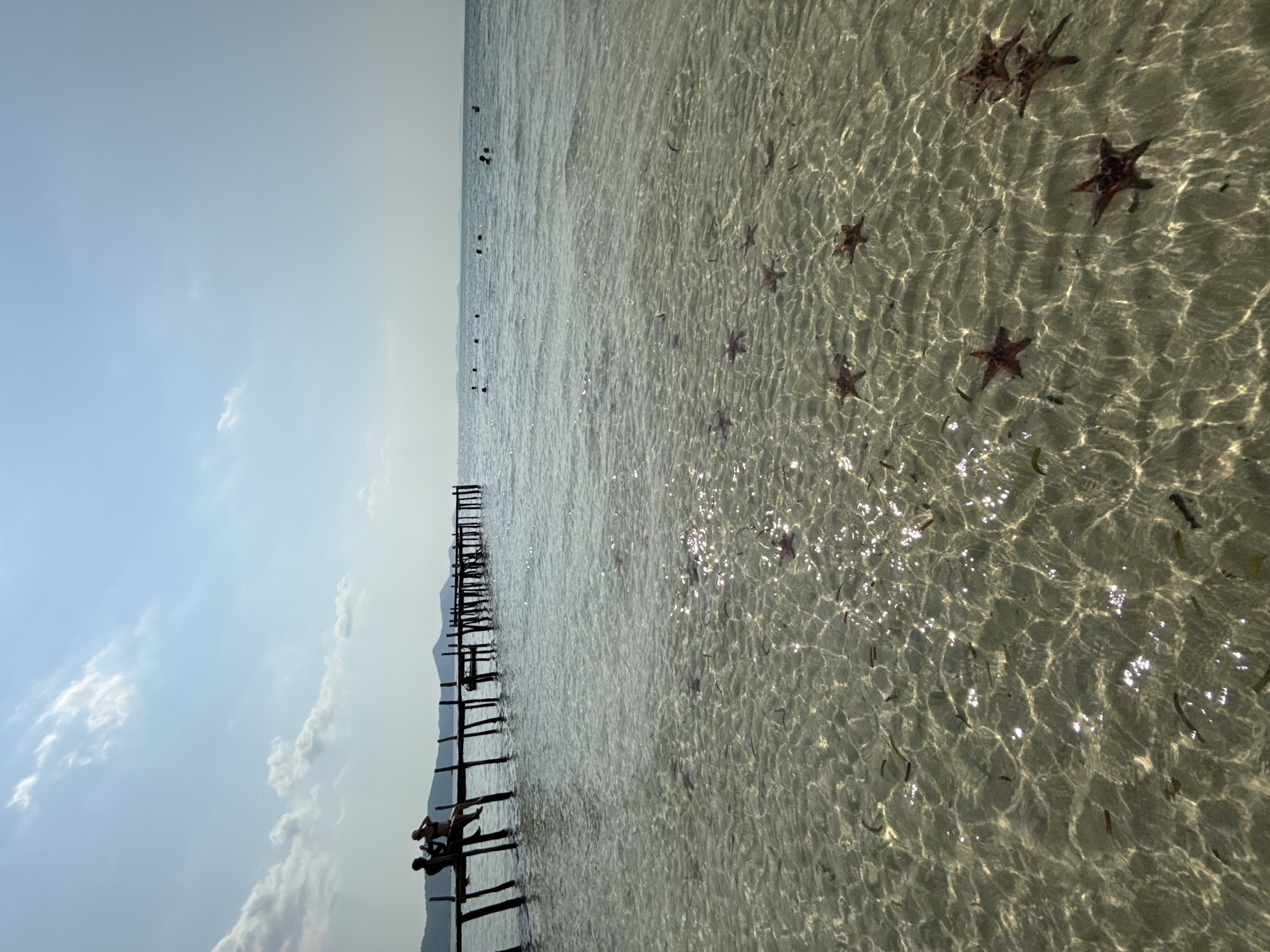This image depicts a coastal scene at a beach in Phú Quốc, Vietnam, under a bright sky with scattered white clouds. The foreground shows shallow, transparent ocean water, revealing a sandy seabed. Numerous dark red starfish are visible on the seabed, alongside sparse fragments of dark marine vegetation. Sunlight reflects off the water's surface, creating shimmering patterns. A wooden pier, composed of vertical support posts and a horizontal deck, extends into the water from the mid-ground towards the right horizon. Two individuals, silhouetted, are seated on the left edge of this pier; one, appearing male, is positioned to the left of the second individual, appearing female. Both individuals are wearing swimwear. In the deeper water beyond the pier, approximately ten additional individuals are partially submerged, appearing to swim or wade. Distant landmasses are discernible on the horizon.