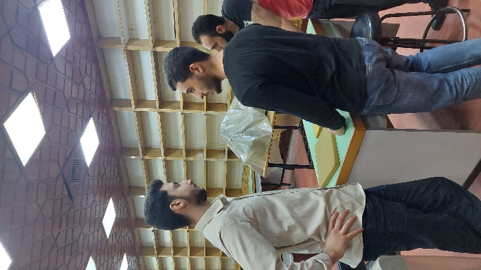 The image depicts an indoor scene within the Ash-Shaghour Municipality, Syria. Three adult males are present in a room characterized by extensive empty light-colored wooden shelving units lining the back wall. The ceiling features a reddish-brown geometric pattern with multiple square, recessed fluorescent light fixtures providing overhead illumination. In the foreground, two men stand near a light-colored table topped with a green surface. Two yellow rectangular objects are placed on this surface. The man on the left wears a light beige long-sleeved shirt and dark blue jeans, standing with his hands on his hips and facing right. The man in the center-right wears a black long-sleeved shirt and blue jeans, facing left, with his hands near the table. A dark-colored stool with a circular seat is positioned beside the latter. A third man is partially visible on the far right, wearing a black shirt with a red accent on the sleeve, leaning over a table. In the mid-ground, a table is covered with a clear plastic sheet, forming a pyramidal shape over an object beneath. The men appear to be engaged in conversation or focused observation within this environment.