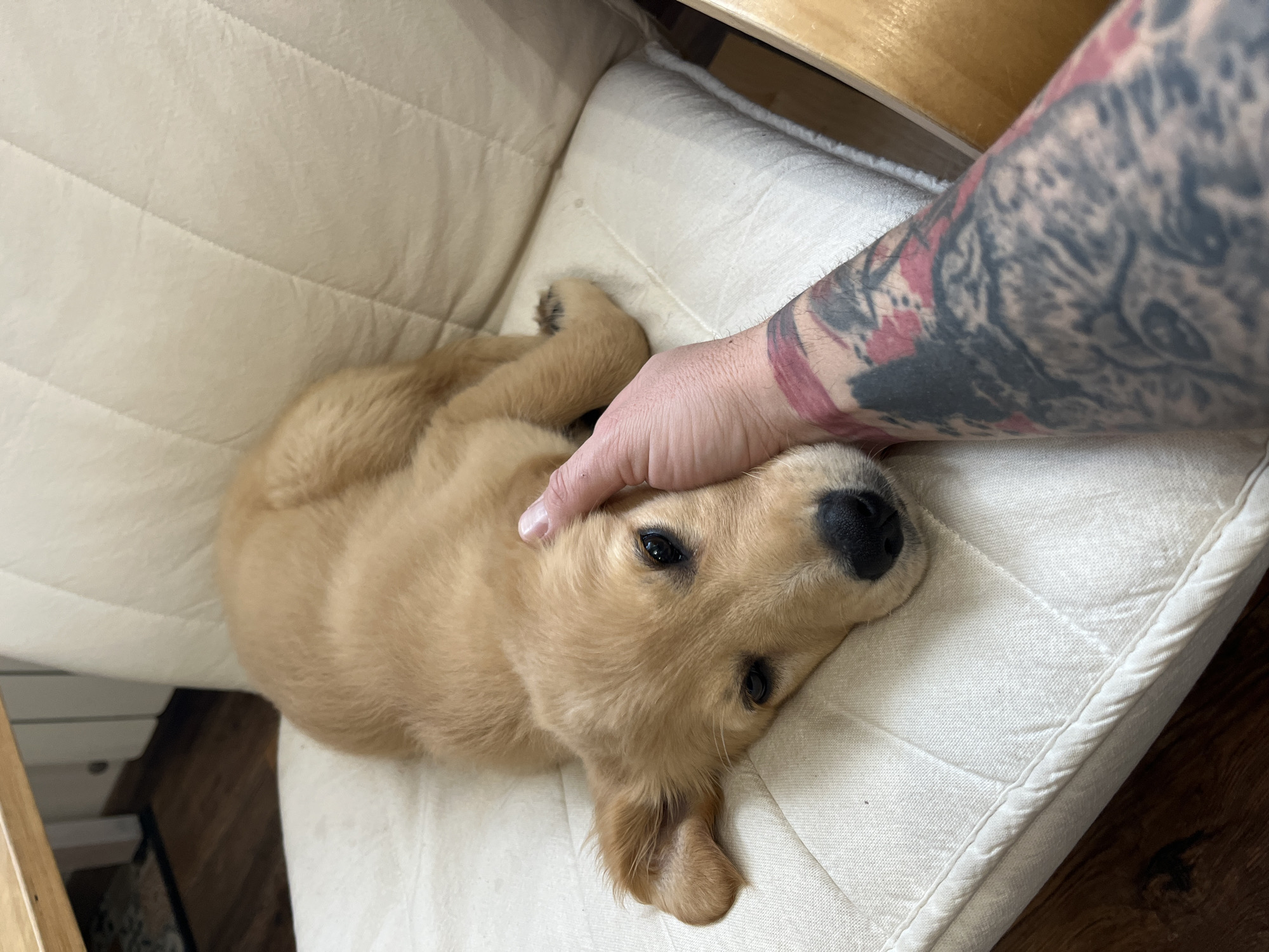 A golden retriever puppy is lying on a white, quilted cushion. An arm with a tattoo is petting the puppy's head. The background is out of focus, but suggests an interior setting with wooden furniture. The exact location within Kostinbrod, Bulgaria is not discernible from the image.