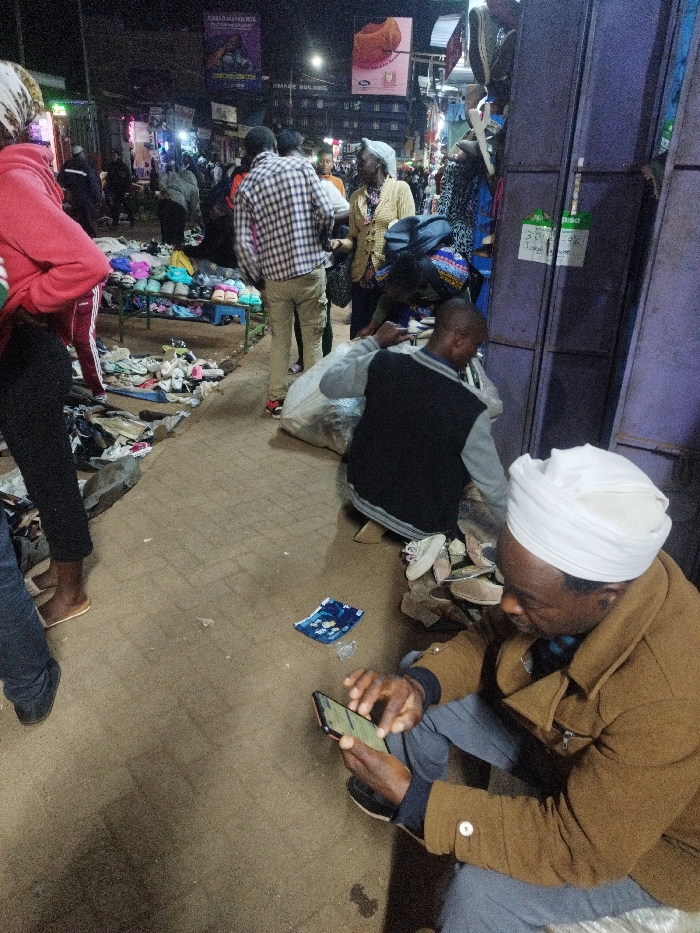 This image depicts a nighttime street market scene in the city of Nyeri, Kenya, illuminated by artificial lighting from streetlights and market stalls. In the immediate foreground, an adult male, of apparent East African descent, is seen squatting on the paved ground, wearing a white headwrap, a brown collared jacket, and grey trousers. He is holding and actively manipulating a black smartphone with both hands. To his left and slightly behind, another adult male, also of apparent East African descent, is squatting. He wears a grey long-sleeved shirt with a black vest and is focused on a large, translucent white bag filled with items, alongside numerous shoes and sandals scattered on the ground around him. Adjacent to him are dark purple metallic market stall panels with green price tags affixed, displaying "300/=" and "250/=" with additional handwritten text. Further into the mid-ground on the left, an individual wearing a red hoodie and dark trousers stands with bare feet (or wearing light sandals) near a pile of footwear spread on the ground. A green metal table to their right displays rows of colorful sandals and shoes. The background reveals a bustling market environment with numerous other individuals, adults, walking, standing, and browsing among various market stalls. Overhead, streetlights and various signs are visible, including "IMAGE BUILDING" and a partially obscured sign for "Nyeri Star". The ground is paved and shows scattered debris, including a blue wrapper. The overall scene suggests active commerce with a focus on footwear sales.