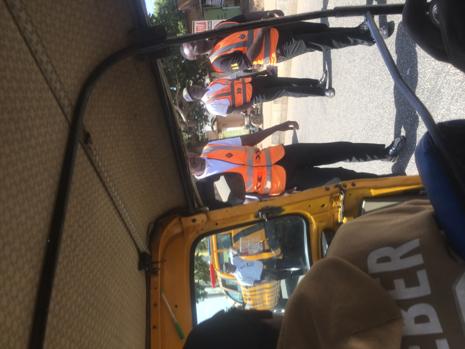A daytime street scene in Jos, Nigeria, is depicted from the interior of a yellow three-wheeled vehicle. The back of a passenger in a brown hooded sweatshirt is visible in the foreground, facing away from the viewer. On the asphalt road to the right of the three-wheeled vehicle, three adult males stand. All three are dark-skinned and uniformly dressed in black trousers, dark shoes, and bright orange reflective safety vests. The foremost man wears a white polo shirt beneath his vest and holds a small, dark rectangular object in his left hand. The central man also wears a white polo shirt, a dark baseball cap, and a vest marked "VIO" with horizontal arrows. The rightmost man wears a dark shirt beneath his vest, which is marked with the number "11" on the chest. These individuals are uniformed personnel, consistent with traffic enforcement officers. Reflected in the three-wheeled vehicle's left window/mirror, a fourth male figure stands next to a yellow pickup truck. This truck features black diagonal stripes and a roof-mounted red and blue emergency light bar. The reflected man wears a white short-sleeved shirt, dark trousers, and a dark cap. The background includes sparse trees, light-colored buildings, and a partially visible sign (e.g., "HOTELIA"), indicating an urban environment under bright sunlight.