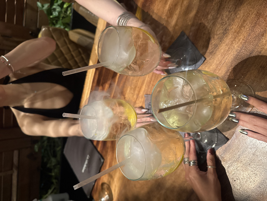 Four cocktails, likely gin and tonics, sit on a wooden table. The drinks are served in large stemmed glasses filled with ice, a straw, and a citrus slice. Each glass is emitting a cloud of vapor, possibly from dry ice. Hands with various rings and bracelets are poised near the glasses. One set of hands has mirrored chrome nails. Black coasters are visible under some of the glasses.