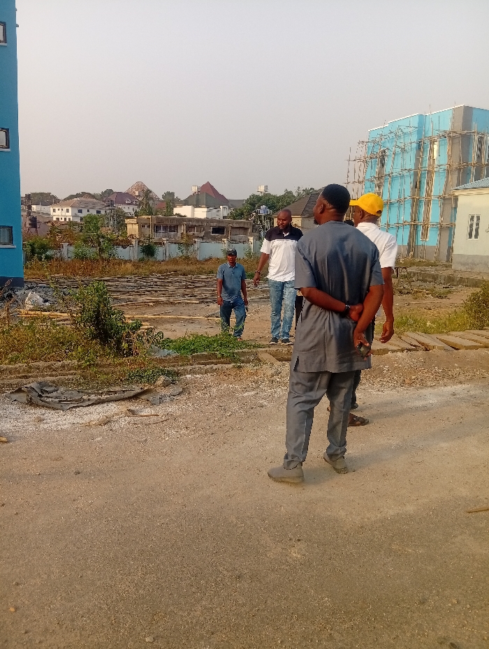 Four men stand on an empty lot. One wears gray, facing away from the viewer. Two men wear white shirts and are seen from the side. The fourth man wears a blue shirt and walks toward the group. In the background, buildings, including a blue building and one under construction with scaffolding, are visible. The land has some vegetation and wooden planks scattered around. The sky is clear and the light suggests it is daytime.