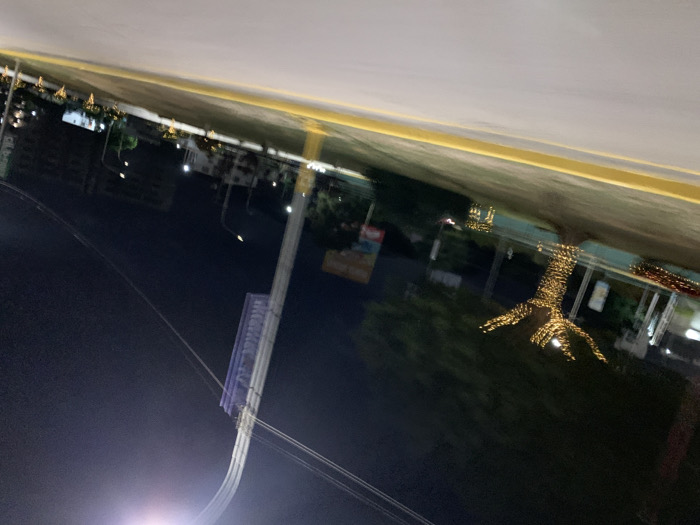 A nighttime urban scene is viewed from above, possibly a balcony or tall building. Streetlights illuminate a dark road. A brightly lit tree with holiday lights stands out. In the distance, buildings and more lights suggest a city. Overhead, a ceiling with a yellow stripe hints at the elevated perspective. The image appears slightly blurry and rotated. Power lines are visible stretching across the lower part of the image.